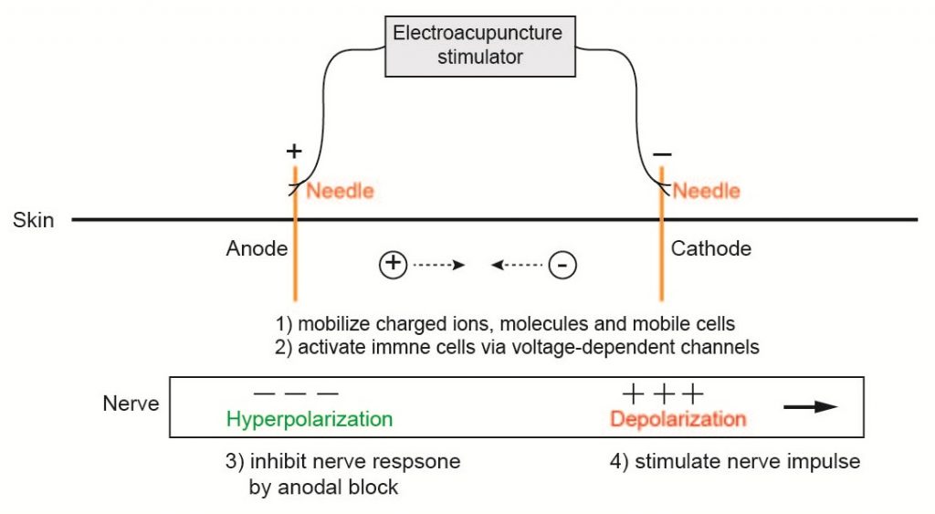 As shown in the above figure, electroacupuncture establishes a temporary electrical field in the tissue under the skin via the anode and cathodes. This electrical field generates the following possible mechanisms that can explain the therapeutic effects of electroacupuncture:
