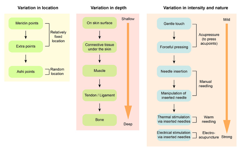 Apparently, acupuncture needling engenders a stimulation of the peripheral tissue, such as the skin, connective tissue under the skin, muscles, tendons, ligaments, and bones. Amazingly, such a tissue stimulation has various forms: from gentle touch at the acupuncture points on the skin, to shallow insertion of the needle without manipulation, to deep needle insertion with needle manipulation. Variation also exists in the nature of the stimulation: from mechanical needle insertion to electrical current conducted into the tissue through the inserted needles, to thermal heating via moxibustion. Those various acupuncture styles enable acupuncture to treat different clinical symptoms. For example, moxibustion is very useful for treating joint pain and infertility as it can provide heat to deep tissues, while electroacupuncture is a powerful tool to treat neuromuscular pain. Those different depths and intensities of stimulation are illustrated in Fig. 2.