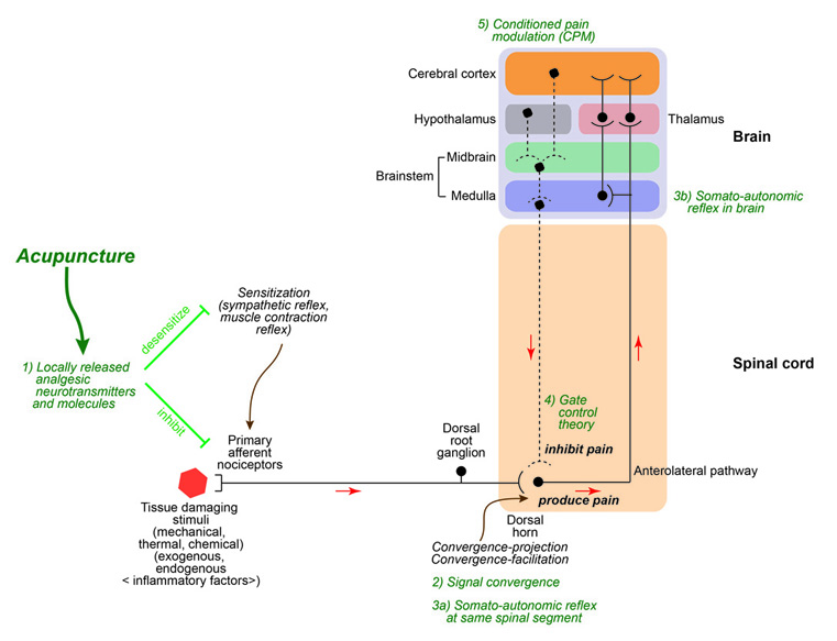 1) Locally released analgesic neurotransmitters and molecules, as a result of acupuncture needling, can inhibit the primary afferent nociceptors and desensitize the sensitization of the sympathetic reflex and muscle contraction reflex, thereby reducing the pain signal transmitted from the periphery nociceptors. This may be important for patients with chronic pain as studies have revealed increased sympathetic activity and reduced parasympathetic activity in patients with chronic pains, such as neck pain, shoulder pain, low back pain, and fibromyalgia, as well as in patients with irritable bowel syndrome (IBS).